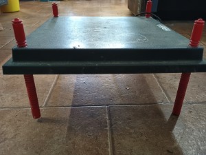 The heat plate is now in the brooder, but as of last weekend, when I figured this out, the chicks were already 10 days old—and this is the last batch for this season. That being said, within 15 minutes of putting the heat plate in the brooder, the shavings underneath climbed to 90 degrees within 15 minutes.